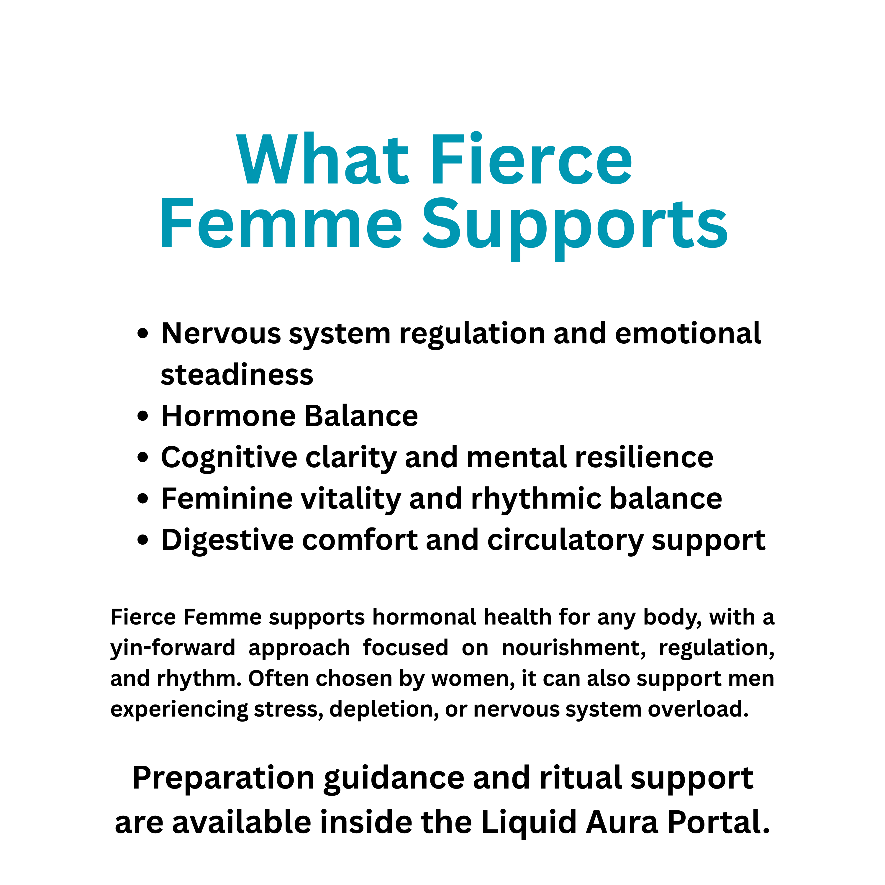 Fierce Femme supports hormonal health for any body, with a yin-forward approach focused on nourishment, regulation, and rhythm. Often chosen by women, it can also support men experiencing stress, depletion, or nervous system overload.